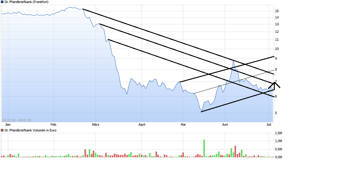 @Ghosty1: Im Chart sehe ich genau diese Range bis zu den oben genannten Werten. Da ist momentan der Deckel drauf. Wenn dieser "wegfliegt", 9 €. Wenn ordentliche Dynamik rein kommt, 10,50 € und anschließend ein Rückfall auf 9 - 9,50 €. Erst wenn nachhaltig die Sorgen um Kreditausfälle schwinden, sehe ich Kurse um 13 - 16 €. Das ist aber noch eine ganze Weile hin, weil das Risiko momentan vorhanden ist. Es kann auch passieren, dass es 2020 und 2021 keine Dividende gibt. Das wäre sogar ziemlich konservativ, finde ICH. Rücklagen könnten das Unternehmen (und den Kurs) gut stützen. Wenn das Geschäft wieder boomt, ordentliche Dividenden gezahlt. Das würde mir gefallen. ;)