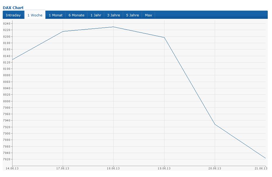Hält die 200 Tagelinie mit Xetraschluss am Freitag (= Tagesschluss + Wochenschluss + Monatsschluss), so fällt der Dax nicht mehr tiefer. Wurde diese Linie erfolglos getestet und ist der Dax nach oben abgeprallt so erfolgt ein weiterer Test (wohlgemerkt bis 28.6.2013). Ist der Dax per Tagesschluss unter dieser Linie so geht er bis 7435 und dann Aufwärts.