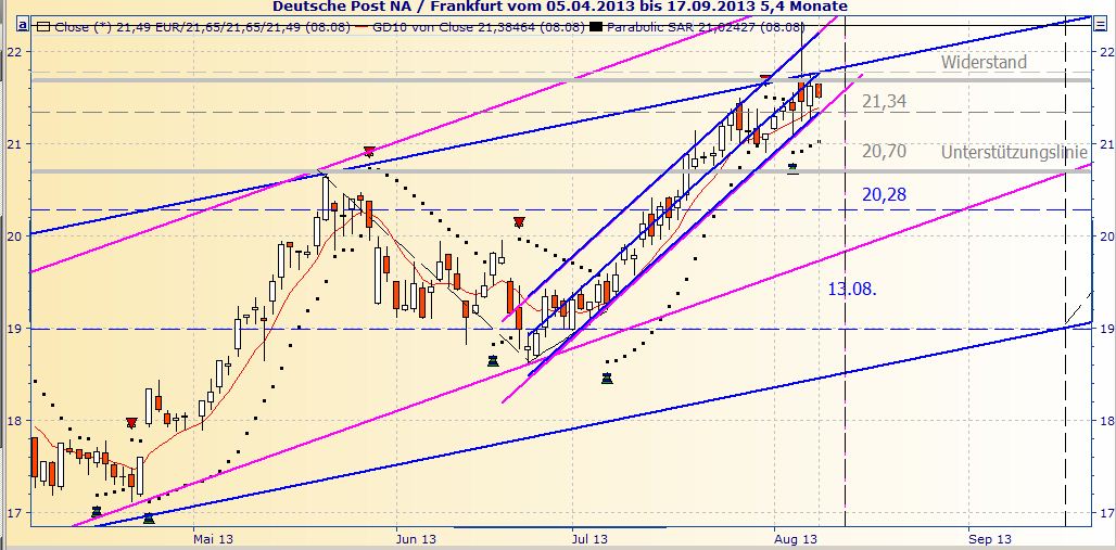 Zeitgleich beginnt jedoch der Dax selbst zu steigen, weil die steigenden Kurse der beteiligten Firmen sehr steil angestiegen sind und den übrigen Markt - nach der notwendigen Anpassung - tendenziell mit nach oben ziehen. Dabei ist die entscheidende Bestätigung meiner Erwartungen, dass die Differenz der Post zum Markt nach der Anpassung an Coba und Telekom etwa beibehalten wird.
