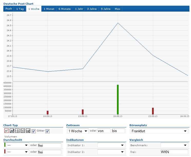 Ich habe mir das nochmals angesehen und meine Erwartung hat sich auch aus wirtschaftlicher Sicht bestätigt. Freitag und gestern - und mit Einschränkungen auch heute - muss man als gemeinsamen Einflussfaktor auf die Post sehen. Dazu kommen aber auch wirklich mittlerweile wieder gute Nachrichten, denn im August (drittes Quartal) sind die weltweiten Lieferumsätze deutlich gestiegen, was auch auf den Geschäftsanfall der Post zutreffen wird. Vorbörslich geht die Post wieder ewas fester, was je nach noch vorhandenem Korrekturbedarf, noch etwas schwächer werden kann. Nicht vergessen, dass ich von einem Pendel ausgehe, was erst einmal "hin" gependelt hat. Es fehlt noch mindestens einmal "her". Vom gestrigen Kurs aus wäre das Richtung 24,40 und aus der Sicht des heutigen Handelsbeginns 24,18 (Das ist genau der Wert, der mit Xetraschluss am Freitag vor der Schlussauktion erreicht wurde).