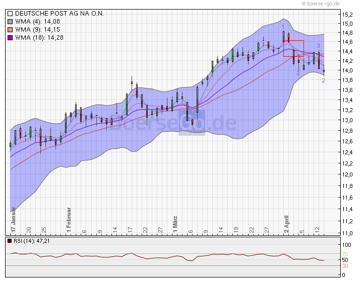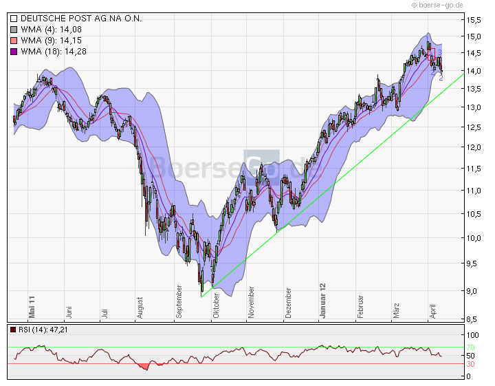 14,00 Euro wird als Bezugswert zur Dividende von 5% nicht nachhaltig unterschritten werden. Das liegt daran, dass in 3 Wochen bereits die Zahlung erfolgt und bei dem jetzt fallenden Markt eher die Dividende mitgenommen wird und dann bei wieder steigenden Märkten die Summe aus Dividende + dem wieder gestiegenem Kurs höher ist als der jetzige Verkauf bei 14 Euro. Dazu würde der Wert von 13,30 Euro nach Dividendenanschlag bereits ausreichen. Da auch die Erwartungen für die Quartalszahlen positiv sind, hat sich der derzeitige Kurs nicht von der Outperformance zurückgebildet sondern aufrechterhalten. Solange der Dax noch nachgeben wird, sollte sich die Post bei etwa 14 Euro einpendeln. Danach geht es jedoch wieder klar weiter aufwärts. Der Dax hat vom Höchststand 2012 bei 7192 etwa 8% nachgegeben die Post von 14,75 etwa 5,5%. Ich sehe daher den zutreffenden dargestellten Chart als nur bedingt aussagekräftig an, da die besonderen Einflüsse der Post den allgemeinen Trend überwiegen.