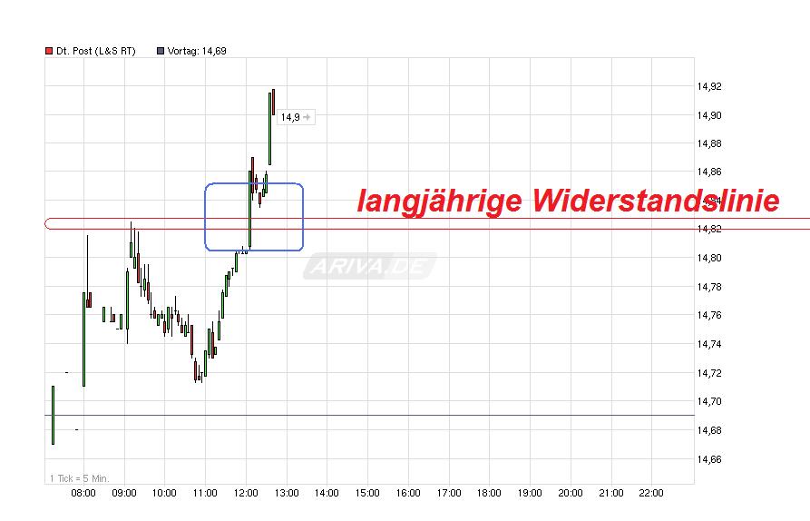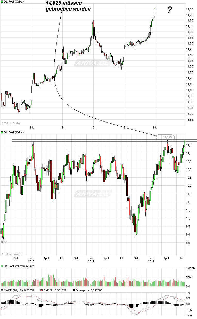 Bei der Post geht die Post ab, wenn man endlich den Widerstand um die 14,90 nachhaltig knackt. Dann wäre der Weg frei Richtung 16,80/17,00 €. Von daher also einfach abwarten bis der Knoten platzt und dann einfach mal schön gehebelt long gehen mit relativ engem SL.
