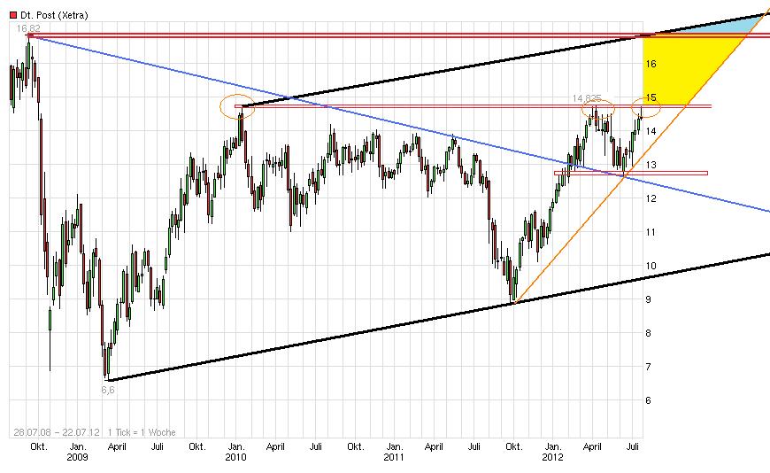 dass der Chart im Dax auf den im dax-daily-video bezeichneten Wert von 6705 hin läuft. Ich betrachte dabei einerseits den Chart im Dow Jones, der einen klaren Aufwärtstrend in Richtung 13200 ausbildet, andererseits noch unter den Erwartungen vor den Präsidentschaftswahlen steht, so dass der derzeitige Abstand zu dem Wert von 13200 von etwa 3,5% mit den Impulsen der Berichtssaison noch weiter nach oben getrieben werden wird. Der deutsche Index wird sich diesem Trend nicht entziehen können. Der Abstand beträgt heute zum erwähnten Ziel von 6705 nur noch 1,7%. Selbst mit einem Abschlag von 1% zum amerikanischen Markt wird der Verlauf des Dax nicht dabei anhalten. Damit würde jedoch ein technisches Ziel bei etwa 6980 angepeilt werden. Auf der Unterseite hat sich der Verlaufskanal noch nicht ausgebildet, sollte aber oberhalb der 200er Linie verlaufen. Wie wirkt sich das auf den Kurs der Post aus? Eine eindeutige Ausbruchsmarke aus der Seitwärtsbewegung ist nicht auszumachen, jedoch sollte mit Übersteigen von 15 Euro ein neues Chartbild eröffnet werden und deutlich höhere Kursziele angepeilt werden. Ohne die Impulse der nächsten Quartalszahlen und nur mit vergleichbaren 3,5% Anstieg sollte die Post bis knapp unter die 15 Euro laufen, dann jedoch kommt der 2. August... Nur zur Erinnerung: Ich hatte nach den Zahlen des ersten Quartals nur eine Pi mal Daumen Hochrechnung von 4 mal 691 = 2,764 aufgestellt, was die Erwartungen des Vorstandes um über 164 Millionen übertrifft. Für die Anhebung der Dividende um 5 Cent sind nur etwa 60 Millionen Euro nötig. Das macht bei 75 Cent insgessamt 900 Millionen, dazu die Steuernachzahlung mit 330 Milionen (zusätzlich zu den Rückstellungen) und die laufenden Steuern - alles von 2,764 Milliarden Euro bezahlbar mit immernoch ordentlichem free-cash für die Kasse. Das ganze sollte jedoch durch die ungleichen Quartale noch übertroffen werden. Bei anhaltender Expansionstätigkeit sollten nach meiner Meinung langfristig Afrika und kurz- bis mittelfristig Indien in den Brennpunkt rücken. Investitionen in diesen Gebieten dürften wie die bisherigen Investitionen deutlich mehr Einfluss auf den Firmenwert haben, denn es sind in den allermeisten Fällen langlebige Investitionen, die nicht kurzfristig wieder abgeschrieben und erneuert werden müssen. Ich sehe auch diesen Faktor bislang nicht genügend in den Firmenwert eingepreist. Das wird im August nachgeholt, zumal mit jedem weiteren Quartal auch die Erwartung der Anleger sich erfüllt, dass die Strategie 2015 des Vorstandes erfolgreich umgesetzt wird, so dass auch weitere zukünftige Dividendensteigerungen aussichtsreicher werden.