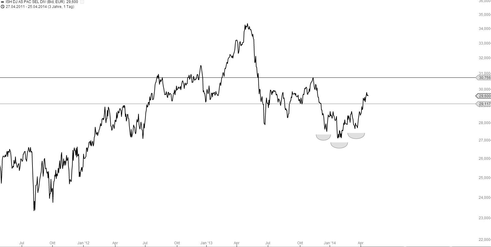Der Ishares läuft seit geraumer Zeit sehr stabil, zeigt sich von den gegenwärtigen Turbulenzen ziemlich unbeeindruckt und hat charttechnisch zudem eine interessante inverse Umkehrformation ausgebildet.