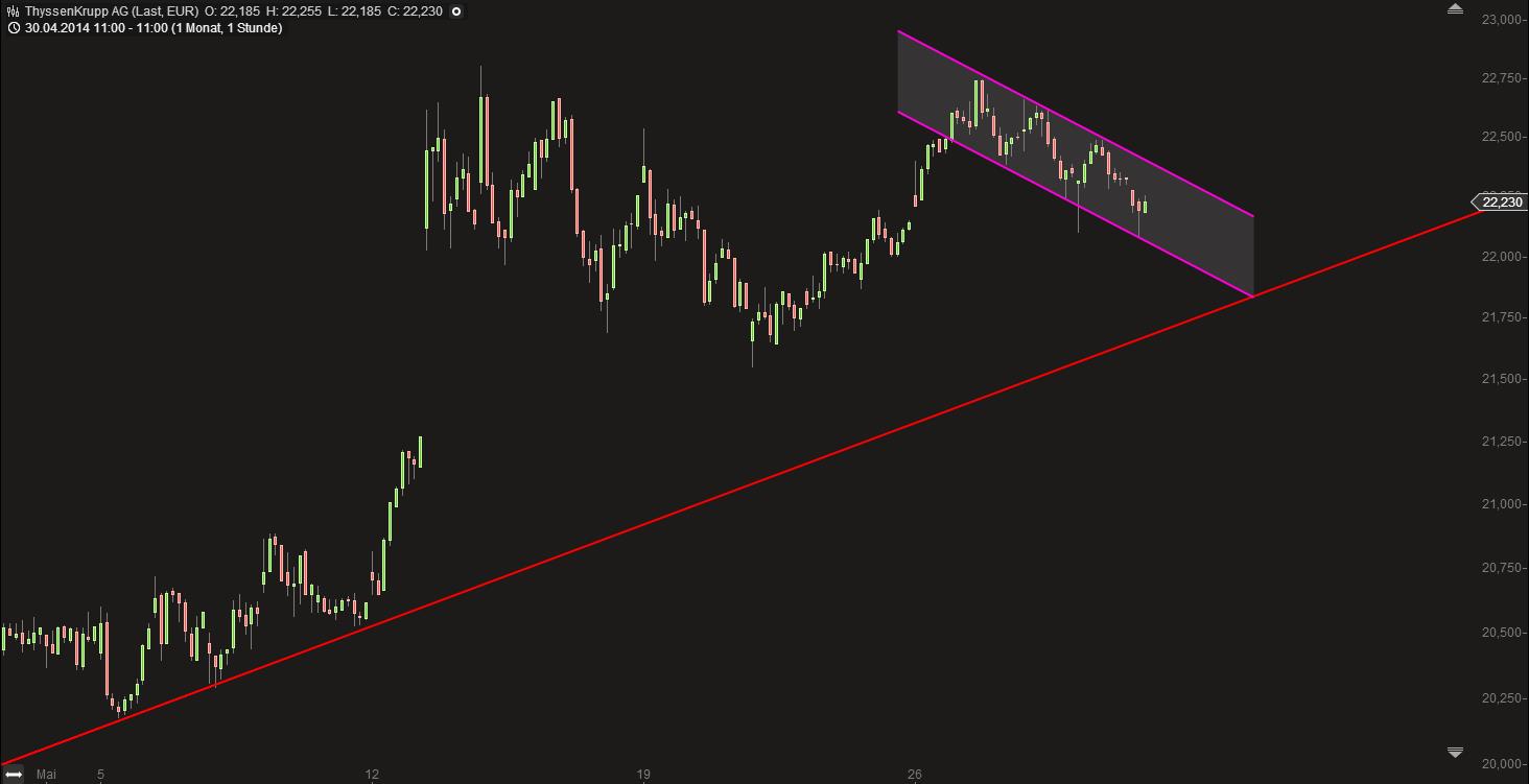 Per Definition handelt es sich bei Thyssen um eine bullische Konsolidierung, die normalerweise nach oben aufgelöst wird. Stop Loss ist schwierig zu bestimmen, hängt auch etwas von deiner Verlustoleranz ab. Möglich wäre der Bruch der Aufwärtstrendlinie oder auch das letzte markante Tief. Dumm ist aber das große Gap, ob das offen bleibt, ist halt die Frage. Es könnte durchaus sein, dass die Aktie noch ein Gap-Fill versucht, bevor sie wieder nach oben blickt.