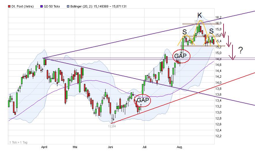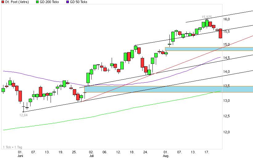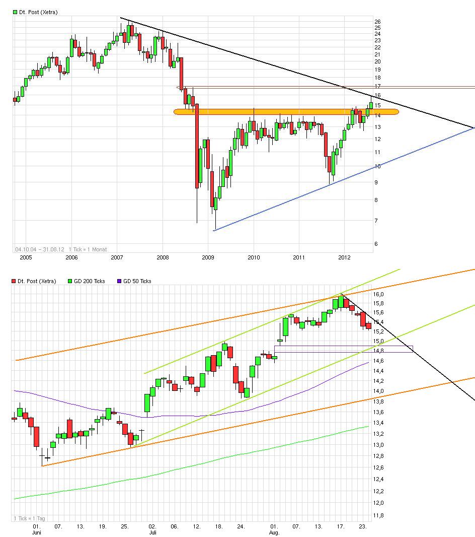 Die Absicht des Vorstandes im Rahmen der Strategie 2015 bis zum Ende der geplanten Laufzeit den Ertrag auf 3,4 bis 3,5 Milliarden Euro zu steigern ist nicht ausschließlich an steigende Investitionen gebunden. Obwohl nicht ausdrücklich benannt, ist die steigende Wirtschaftstätigkeit und auch die anhaltende Steigerung der Marktanteile in den aufstrebenden Ländern Asiens und Afrikas damit verbunden. Der Vorstand hat bereits angedeutet, dass die Investitionen zwar ansteigen werden, jedoch nur absolut und nicht relativ. Das hat für Anleger ausgesprochen gute Aussichten. Die gesteigerten Geschäftstätigkeiten sind an die bereits vorhandenen Investitionen eingebunden und werden gezielt um die nächsten ausgebaut. Wie ein wachsendes Spinnennetz dessen bestehende Grösse den derzeitigen Ertrag erbringt und dessen Wachstum stetig unter geringerem Aufwand vorangetrieben wird, kann die Post nach und nach seine Position ausbauen und gleichzeitig den Ertrag aus dem Umsatz heraus steigern. Ich vermute, dass die Investitionen der letzten Zeit ihre volle Wirkung erst nach und nach entfalten werden, zumal auch damit ein gesteigertes Ansehen bei den Kunden verbunden ist. So grosse Anlagen wie die, die in diesem Jahr angeschafft worden sind, werden nicht immer und überall errichtet. Die Knotenpunkte der nächsten Jahre werden irgendwo in Richtung Afrika und Brasilien errichtet. Dort steht jedoch noch nicht fest, wie das am besten zu steuern ist. Konzentriertes Beobachten der Warenströme und gezielter Ausbau der flächendeckenden Marktpräsens werden den Vorsprung gegenüber der Konkurrenz auch erweitern, besonders da, wo die Leistung schon durch die Knotenpunkte optimiert worden ist. Die Kosten der Investitionen sind vom Vorstand mit 1,6 Milliarden Euro jährlich veranschlagt. Das kann und sollte leicht beibehalten werden. Das bedeutet für die Jahre 2013 bis 2015 jeweils einen leichten Anstieg der Erträge zusätzlich zur Umsatzsteigerung. Die prozentualen Investitionen hätten damit in diesem Jahr ihren Höhepunkt erreicht und der free-cash-flow wird ab dem nächsten Jahr ansteigen. Die Dividendenleistung aus den oben erwähnten 3,4 bis 3,5 Milliarden Euro vor Steuern (Betrag abzüglich 28% Steuern und Quote 40-60%) ergibt locker 1 €. Hinzu kommt die Ertragssteigerung, die für 2% Steigerung pro Jahr mindestens 1 Cent Dividende ausmacht. (2% Steigerung in 2013 macht 1 Cent, 4% in 2014 macht 2 Cent und 6% in 2015 macht 3 Cent - berechnet auf 50 prozentiger Ausschüttung) Nicht einbezogen in diese Berechnung ist der verminderte Anteil der Kreditverpflichtungen, der durch die gute Geschäftslage in Zukunft ebenso positiv wirkt. Bei einer Aktienanlage mit der Post kann man jetzt schon eine vorsichtige Berechnung bis zum Ende der geplanten Strategie 2015 anstellen. Die jetzige Anlage bei 15,60 Euro für erwartete 75 Cent steigt auf erwartete 103 Cent ab 2015 mindestens. Das sind dann 6,6% zusätzlich zum Kursgewinn. 20,50 Euro sehe ich als realistisch an. Die Strategie 2015 ist bislang mehr als nur voll aufgegangen, und je näher das Ziel kommt, desto höher wird die Bewertung der Aktie ausfallen. Richtig lohnende Einstiegskurse für langfristig orientierte Anleger werden nicht bis zum Ende der Laufzeit der Strategie zu erzielen sein. 2012 und 2013 sollte man voll einsteigen, danach nur noch bei Schwäche nachkaufen, denn der Preis wird ordentlich ansteigen auch über das Jahr 2015 hinaus.