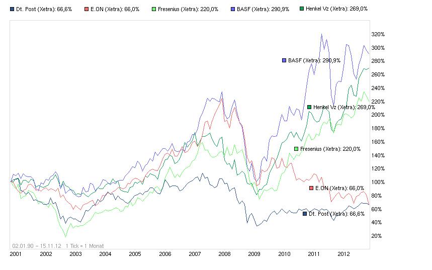 Nr. 1426 bringt eine sehr gute Grafik zur Kursentwicklung, die jedoch die unterschiedlichen Dividendenentwicklung nur als Abschlag mit kennzeichnet, aber keinen prozentualen Betrag dazu verwertet.