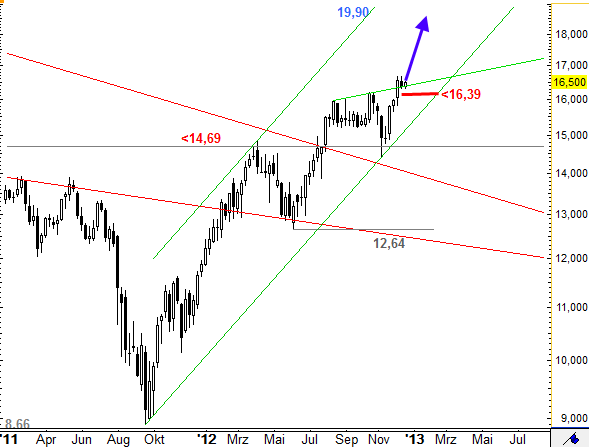 Das Jahr 2013 hat begonnen, und es stellt sich sogleich die Frage, wohin die Reise geht. Bis zur Bilanz ist es noch etwas Zeit und gerade jetzt sollten die Weichen für das ganze Jahr gestellt werden. Entscheident dafür ist jedoch die möglicherweise unzureichende Auffassung vieler Anleger der Post, ob und wieviel der Geschäftsentwicklung bereits in den Kursen enthalten ist. Nimmt man als Basis die Erwartungen des Vorstandes, so reicht bereits ein dürftiges viertes Quartal aus um diese Erwartungen zu erfüllen. Vorgegeben war bis zu 2700 Mio. was mit ca. 660 Mio. im vierten Quartal erreicht werden würde. Das entspräche einer unterdurchschnittlichen Leistung, die nicht einen Kurs von 16,80 rechtfertigen würde. Geht man von einer durchschnittlichen Entwicklung im vierten Quartal mit einem Betrag von 730 Mio. aus, so würden die Erwartungen des Vorstandes bereits um 70 Mio. übertroffen werden und der Jahresschlusskurs seine Berechtigung haben. Allerdings sind die letzten Äusserungen zum Geschäftsverlauf von der Post und auch deren Kunden deutlich positiver ausgerichtet. Da war vom Rekordgeschäft zu Weihnachten die Rede, was aber schon sehr frühzeitig im vierten Quartal eingesetzt hat. Damit würde ich den Ertrag deutlich höher ansetzen. Im zweiten Quartal lag das Ergebnis bei 746 Mio. - der Abstand sollte mindestens 4% nach oben betragen also 775 Mio. übersteigen. Das macht für die Jahresbilanz einen Betrag der 2800 Mio. übersteigt. Das ist ein Wert der noch nicht im aktuellen Kurs enthalten ist. Von da aus kann man zusätzlich die nächsten Erwartungen des Vorstandes mit 2900 bis 3000 Mio. schätzen, die einen Kursausblick auf über 20 Euro rechtfertigen würden. Es spielt eine wichtige Rolle, dass damit der negative Einmaleffekt aus dem Vorjahr, der aber bereits aufgearbeitet wurde, nunmehr als positiver Effekt hinzugerechnet werden muss. Bei einem Ergebnis von 2800 Mio. und einer durchschnittlichen jährlichen Steigerung der Geschäftstätigkeit, von der man ausgehen kann, wären 2940 Mio. ein realistisches Ziel in konservativer Betrachtung. Aus diesem Betrag würde sich rein rechnerisch auch eine Dividende von 95 Cent herleiten lassen. 95 Cent Dividende entsprechen einer 19 Euro Kursanlage, sofern die Dividende mit 5% Kurswert veranschlagt wird. Da für den Jahresausblick auf den Dax keine verlässlichen Angaben gemacht werden können, sollte gerade jetzt noch vor Bekanntgabe der Bilanz 2012 noch eine günstige Kaufgelegenheit bestehen, obwohl der Gesamtindex ziemlich hoch bewertet wird.