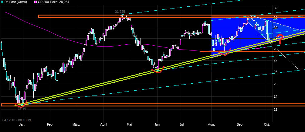 (Übrigens bei knapp über 28 wird der gesamte Aufwärtstrend vom letzten Verlaufshoch zurückgenommen. Bin gespannt ob sich das der Markt traut.)