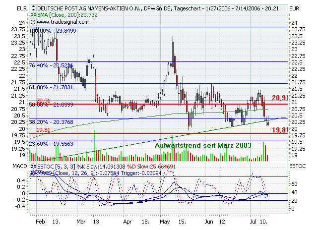 Rückblick: Die Aktie der DEUTSCHEN POST markierte nach mittelfristiger Aufwärtsbewegung im Februar 2006 ein Zwischenhoch bei 23,85 Euro, nur knapp unterhalb des AllTimeHighs bei 24,78 Euro, und startete eine Abwärtskorrektur. Mitte Juni rutschte die Aktie dann unter die exp. GDL 200 (EMA200) auf Tagesbasis zurück. Die Aktie fiel erneut auf die Aufwärtstrendlinie seit März 2003 zurück. Insgesamt ist das seitwärts gerichtete Bewegungmuster seit Mai wenig bullisch zu werten, weshalb das kurzfristige Chartbild einen leicht bärischen Beigeschmack erhält.