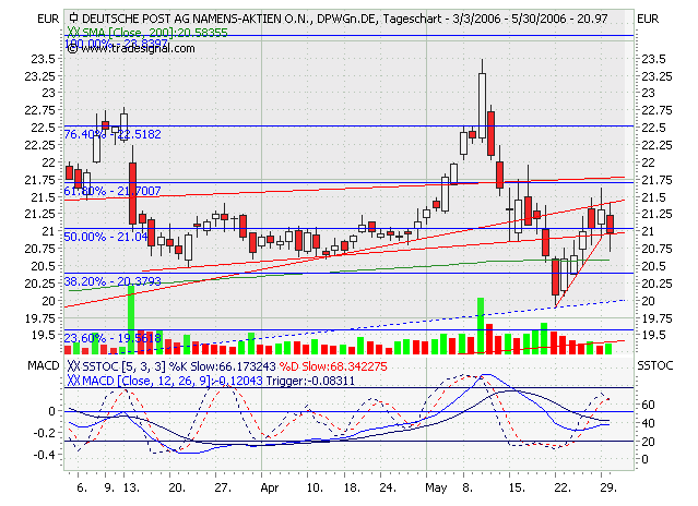 Die Deutsche Post AG strebt in ihrem Expressbereich langfristig eine deutlich höhere Rendite an als derzeit. Nach 2009 sei eine EBIT-Marge von 10% geplant, sagte Express-Finanzvorstand Oliver Gritz am Dienstag auf einer im Internet übertragenen Analystenkonferenz in New York. In den ersten neun Monaten dieses Jahre betrug das Verhältnis vom Umsatz zum Ergebnis vor Zinsen und Steuern erst 0,7%. Der gesamte Expressbereich ist durch hohe Verluste im US-Geschäft in Mitleidenschaft gezogen.Die Deutsche Post Aktie bewegte sich in einem langfristigen intakten Aufwärtstrendkanal. Aus diesem ist sie signifikant nach unten ausgebrochen, jedoch im weiteren Verlauf (am 21.09.2006) erneut in den Aufwärtstrendkanal eingetreten. Dadurch hat sich das Chartbild wieder verbessert, denn es besteht nun die Hoffnung, dass die Deutsche Post Aktie Ihren langfristigen Aufwärtstrend fortsetzt. Erst bei einem weiteren signifikanten Ausbruch aus dem Aufwärtstrendkanal würde sich das Chartbild erneut verschlechtern. Die Kursentwicklung bestätigt somit wieder den bisher aussichtsreichen Chartverlauf. Aus diesem Grund können die Aktien-Positionen wieder unter Beachtung der Indikatorenanalyse aufgebaut werden.