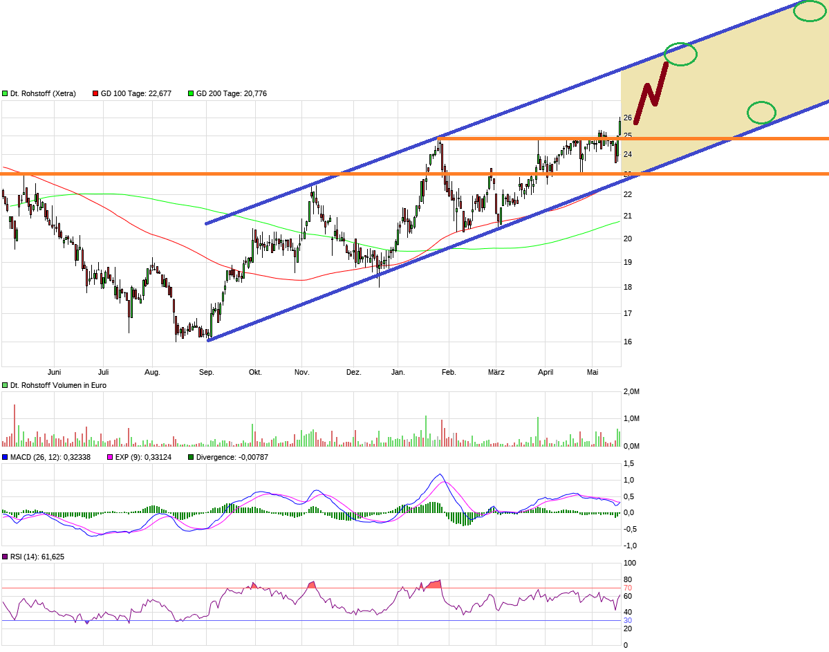 Gefährlicher wird es erst, wenn die Halbjahreszahlen bzw. Q2 sehr schwach ausfallen und/oder der Kurs wieder unter 23 € fallen würde. Dann müsste man nochmal mit 20,5 € im Ernstfall rechnen. Risiko also etwa 20% bei aus meiner Sicht 20-25% Chance kurzfristig und 60% Chance mittelfristig. Siehe angehängter Chart!