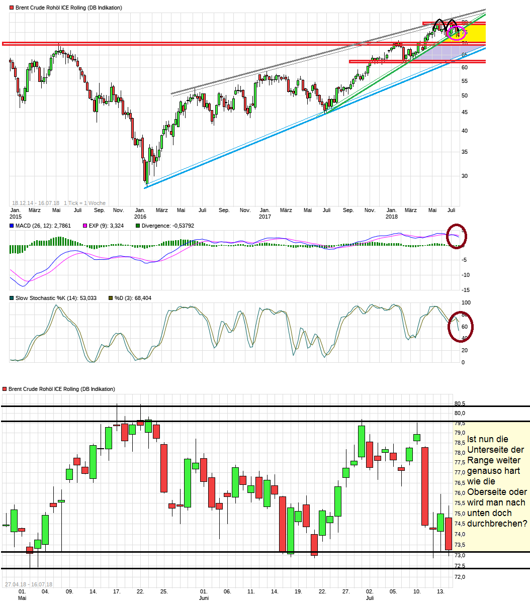 Also wenn Trump weiter den Handelskrieg gegen China hart ausweiten sollte, dann könnte das amerikanische WTI Öl in einer Vergeltung mittels Zölle deutlich verteuert werden in China, was sicherlich auch nicht preisförderlich für diese Sorte wäre. Zudem ist Libyen jetzt wieder mit über 800.000 Barrel zusätzlich im Spiel, weil man seine östlichen Häfen wieder frisch in Betrieb hat. Also wirklich überzeugende Gründe warum in der nächsten Zeit der Ölpreis nach oben wegfliegen sollte über das bisherige Jahreshoch, nachdem man bereits so stark gestiegen ist in den Vorjahren, kann man nicht wirklich erkennen. Da müßte wohl etwas unerwartetes erst geopolitisch passieren, um das zu ändern. Bei den hohen Verkaufspreisen wird Fracking volumenmäßig immer weiter ausgebaut, d.h. die Angebotsmenge an WTI dürfte stetig weiter steigen und die OPEC und Rußland fördern inzwischen mehr und haben ein ganz ureigenes Interesse, daß der Ölpreis nicht noch weiter steigt, da sonst noch mehr Marktanteile in andere Hände fallen würden ( und natürlich auch die Alternativen zu fossilen Rohstoffen immer mehr Auftrieb bekämen). Besonders die Russen scheinen das Angebot noch deutlicher erhöhen zu wollen als zuletzt eh schon beschlossen.
