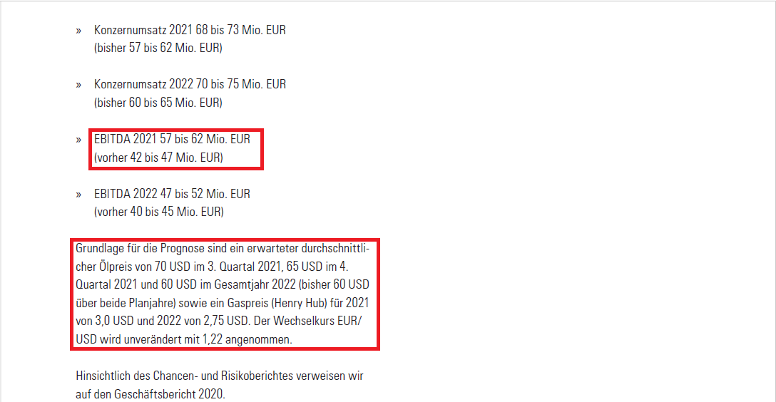 Damit vervierfacht sich die aktuelle Produktion und die Bohrlöcher würden sich bei einem Erdölpreis von 55 USD innerhalb der ersten zwei Jahre amortisieren. Begeistern dürfte Anleger von Deutsche Rohstoff AG die jüngst angehobenen Prognosen für 2022. Durch zusätzliche Bohrungen steigen die Umsätze ab 2022 und da die Erdöl- und Erdgaspreise im bisherigen Prognosezeitraum deutlich gestiegen sind, erwartet das Unternehmen nun Umsätze zwischen 98 Mio. EUR und 106 Mio. EUR. Das EBITDA soll zwischen 70 Mio. EUR und 76 Mio. EUR betragen. Vergleicht man das mit den ursprünglichen Planzahlen von 47 Mio. EUR und 52 Mio. EUR EBITDA, dann ist das ein Sprung von fast 50%! Bei einer Marktkapitalisierung von derzeit 89,7 Mio. EUR ist die Aktie bei einem Kurs von 17,90 EUR als sehr günstig zu betrachten.