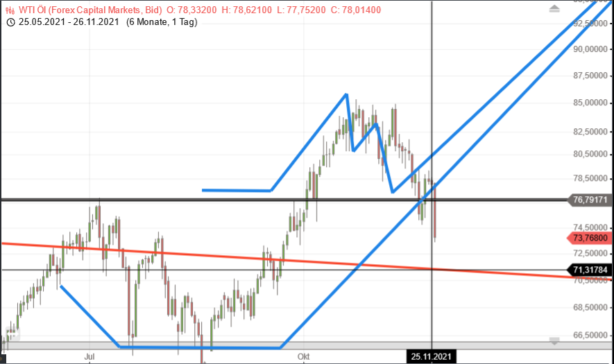 Nach dem Durchbruch des 13 Jahre alten Widerstandes, war ein Rücksetzer auf die Grundlinie bei 71,31 § zu erwarten. Der Ölpreis bewegt sich weiterhin im erwarteten Korridor trotz des heutigen selloffs. Da werden vor dem Wochenende Postionen aufgelöst wegen der neuen Mutation, die vermutlich nächste Woche wieder Schnäppchenjäger auf den Plan rufen werden.