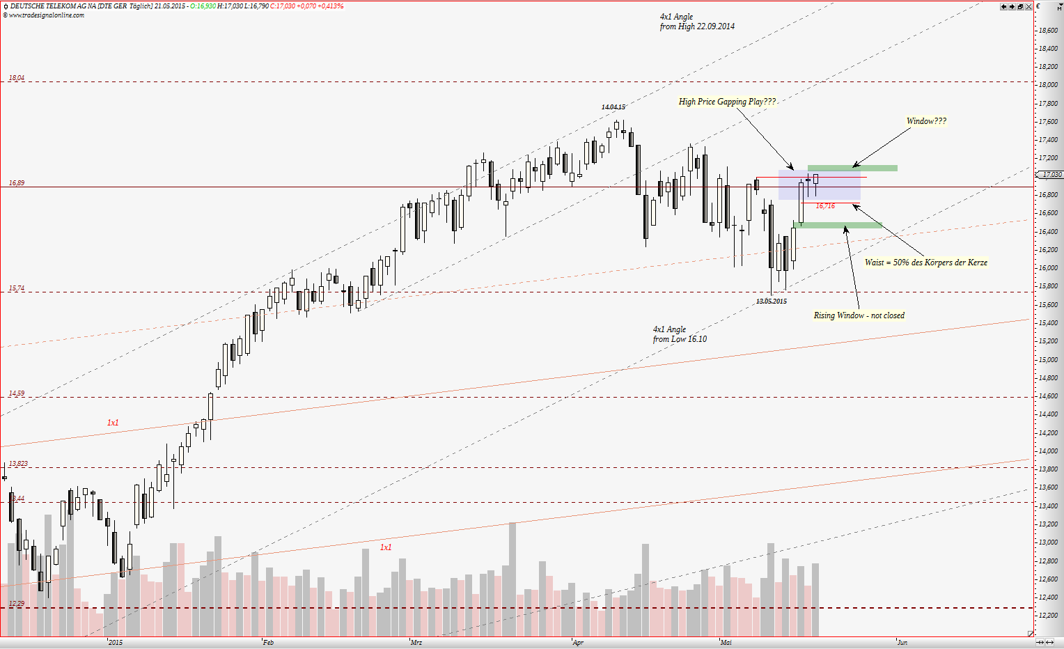 http://papiertrading.blogspot.de/2015/05/...ones-update-17052015.html ich orientiere mich an Dow Jones, weil ich dort reichlich Daten aus der Vergangenheit habe. Telekom, wie ich schon geschrieben habe, brach Hoch vom 2005 - deswegen greift hier die Regel Nr. 1 von Gann: Kaufen wenn alte Hochs brechen. Es gibt 1000e Beispiele, wo ein Wert Jahrelang in einer Range notierte und nach einem Ausbruch sehr schnell stieg. Deswegen gehe ich davon aus, dass die Kurse schnell werden. Nach dem Preis zuerst über 12,5€ und dann über 15,00 sprang, ändert sich auch Winkellinie - diese wird steiler, daher noch ein Signal, dass die Kurse schneller werden.