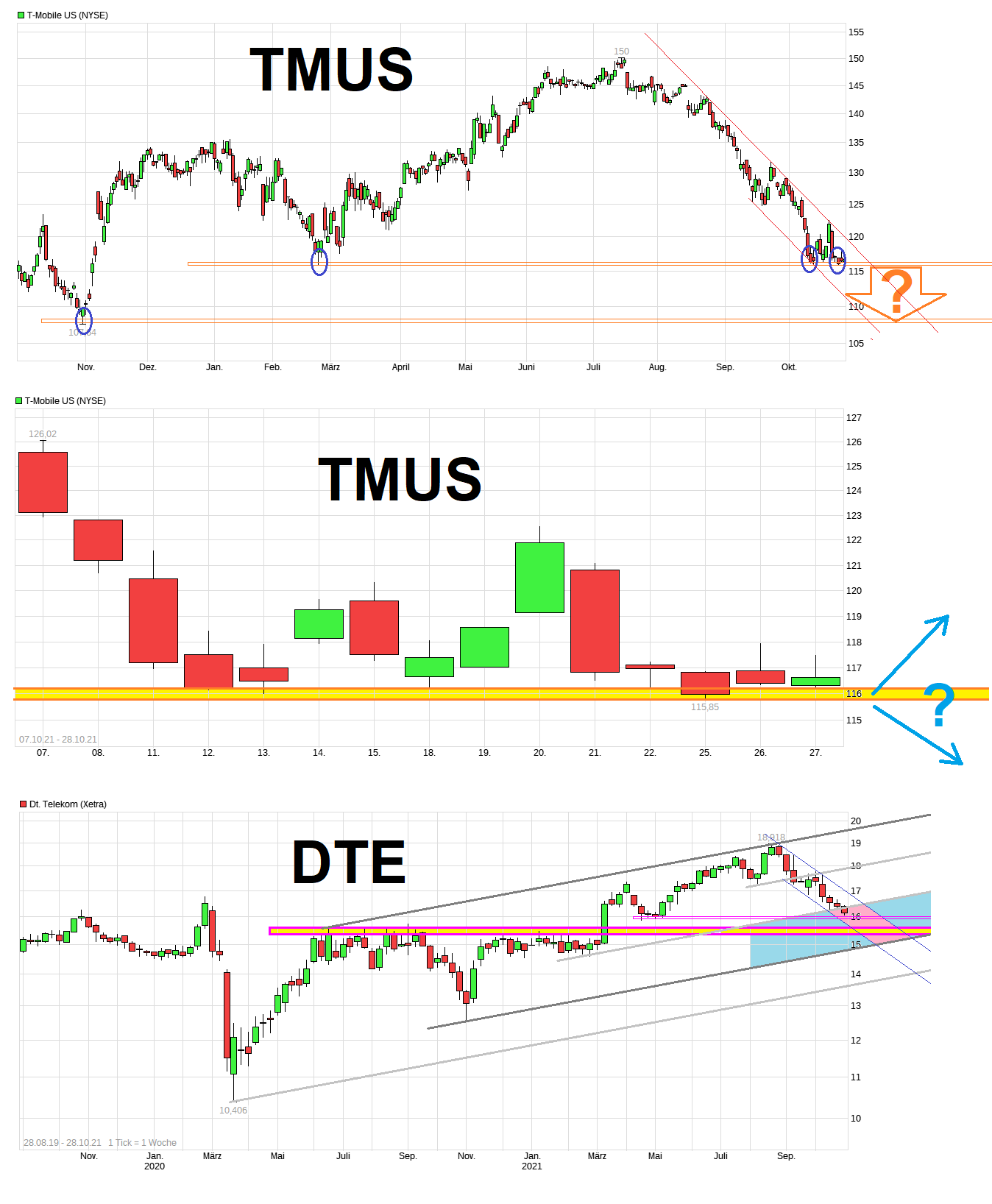 Jeder Euro Rücksetzer bei TMUS bedeutet bekanntlich automatisch einen Wertverlust für die DTE von ca. 500 Mio. Euro. Somit könnten hier im ungünstigen Fall um die 4 Mrd. Euro an Wertschwund bei dem Dt. Telekom-Anteil an TMUS in der nächsten Zeit nochmal drohen, falls man die momentane Unterstützung um 116$ klar aufgeben würde. DTE hat aktuell eine MK von 76,4 Mrd. Euro. Das wären dann ca.5% der DTE MK. Aktueller Kurs der DTE 16,15€ . Weitere 5% Kursverlust wären dann ein denkbarer Rückgang in den Bereich von ca.15,35€. Also ganz grob in diesen Bereich könnte es also hingehen bei der DTE, wenn man in den USA bei TMUS nochmal ein Stockwerk tiefer fahren sollte. Und im Bereich von ca. 15,30/40 gäbe es dann eine klare horizontale Unterstützungszone bei DTE. Von daher dürfte sich keiner sonderlich wundern, falls man in den nächsten Wochen dort noch landen würde. Denke aber in dem Bereich müßte dann die Konso der DTE erstmal gelaufen sein und man wieder nach oben blicken (falls nicht irgendwas dramatisches an der Gesamtbörse sonst passiert). Allerdings ist es ein ungelegtes Ei, da eben die 116$ noch nicht gefallen ist. Alternative wäre natürlich auch, daß es doch noch genug Bullen gibt, die weiter Beton anrühren und einen nachhaltigen Rutsch unter 116$ verhindern bei TMUS. Also mal schauen wie man jetzt weiter auf diesem sehr dünnen Eis klar kommt . Sicher an der Börse ist nur, daß nichts sicher ist ;)