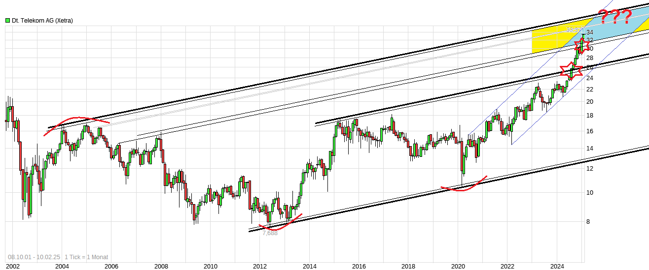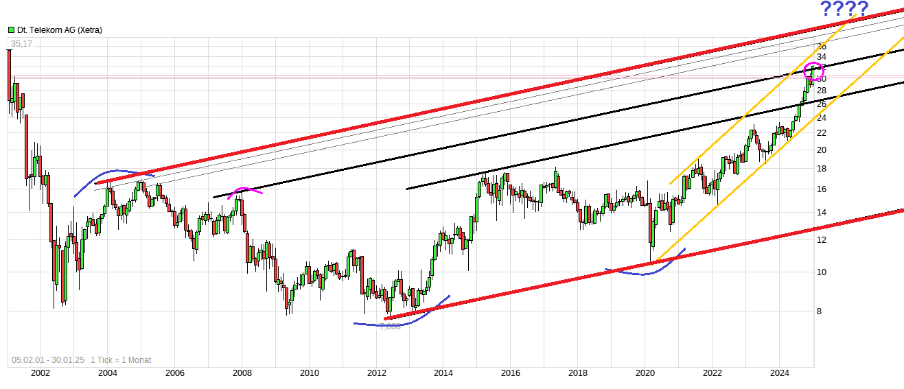 Vergessen sollte man zudem nicht wie viel Euro Divi man seit dem Börsengang bereits ausgeschüttet hat. ( https://www.telekom.com/de/investor-relations/aktie/dividende "...Seit dem Börsengang im Jahr 1996 hat die Deutsche Telekom 15 € je Aktie oder insgesamt mehr als 62 Milliarden € an Dividenden ausgeschüttet (Stand Mai 2022)..."). Wobei man alte Kursstände auch noch deflationieren sollte, da sich natürlich durch die Inflation über die Jahre Dinge auch hier negativ real geändert haben. Also unter charttechnischen Gesichtspunkten wäre es jetzt aus meiner Sicht wichtig sich über der 32er Marke zu etablieren. Dann könnte man den Blick weiter nach oben richten in Richtung der Oberseite des roten langjährigen Aufw.trendkanals. Dafür müßte aber auch die Tochter T-Mobile US weiter kursmäßig Gas geben, da die "Mutter" inzwischen mehr ein Anhängsel der hochwerthaltigen Tochter ist als umgekehrt. Das kann sich länger hinziehen, da es noch ein gutes Stück nach oben wäre bis dahin. Aber solange zumindest die Richtung weiter eingehalten wird sollte man nicht klagen.