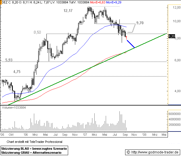 Da gebe ich dir vollkommen recht Ohase, deutz wird 2008 ein Gewinner sein, sobald die Aktie den Bereich zwischen 7,40 bis 7,80 überwunden hat wird es wohl einen vergleichbaren aufwärtstrennt wie von Jan 2006 bis Jan 2007 geben, sehe bei überschreiten der 8 euro ein gutes Stopploss Limit und dann kanns steil bis 9,40 hochgehn bevor ein doch größeren Wiederstand anzutreffen ist.