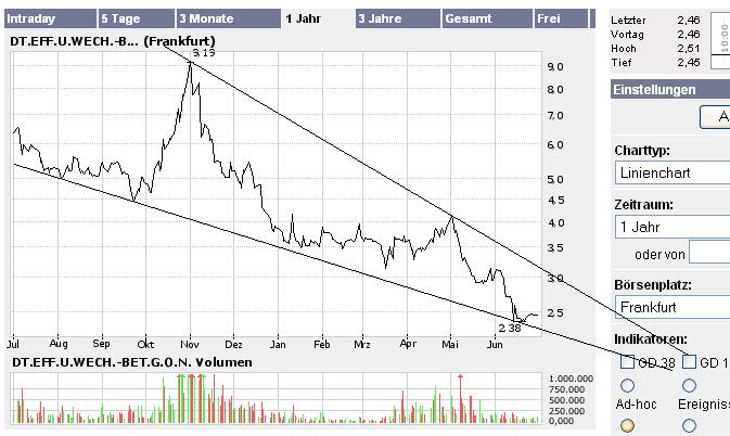 Jetzt ist der Einstiegszeitpunkt da! Anleger sollten sich nicht über den Kursverlauf bei der Beteiligungsgesellschaft DEWB AG wundern. So sieht es nun mal aus, wenn ein Großaktionär gnadenlos abverkauft. Zu dieser Erkenntnis gelangen die Experten von BetaFaktor. Immerhin über 70 Prozent hielt die Jenoptik AG einmal direkt und indirekt, inzwischen dürfte die Quote nahe Null stehen. Für Jenoptik eine strategische Entscheidung, die nichts mit dem operativen Verlauf bei der DEWB zu tun hat. Denn nach dem Verkauf der M+W Zander wollte man sich ganz auf den Laser-Bereich konzentrieren. Die DEWB dürfte sich damit quasi zu 100 Prozent in Streubesitz befinden. Und nun lohnt wieder ein Blick aufs Fundamentale. Die Halbjahreszahlen waren mehr oder weniger ein Nicht-Ereignis. Ein Ergebnis nach Steuern von 1,3 Millionen Euro wurde erwirtschaftet. Viel wichtiger bei einem Beteiligungsunternehmen ist aber der Wert der Portfoliounternehmen - in diesem Fall 13. Selbst wenn man sich am Buchwert orientiert, kommen 2,55 Euro/Aktie heraus und damit über 10 Prozent mehr als der aktuelle Kurs. Entscheidend aber ist, dass die Perle – Noxxon Pharma AG – erheblich mehr wert sein sollte als die Bilanz ausdrückt, meinen die Autoren von BetaFaktor. Noxxon hatte im ersten Halbjahr 2006 einen Vertrag mit der amerikanischen Pfizer abgeschlossen, der u.a. auch eine Kapitalbeteiligung beinhaltet. Die DEWB hält über 61 Prozent an Noxxon. Im zweiten Halbjahr steht noch der Exit der KSW Microtec an, ein SmartLabel-Hersteller. Die DEWB hält hier 29,7 Prozent. Laut der BF-Autoren sind dies genug Gründe, um jetzt auf eine Gegenbewegung zu setzen. 3,00 Euro sollten auf Sicht von einigen Wochen machbar sein.Behandelte Wertpapiere DT.EFF.U.WECH.-BET.G.O.N. (DE0008041005; 804100; EFF) "