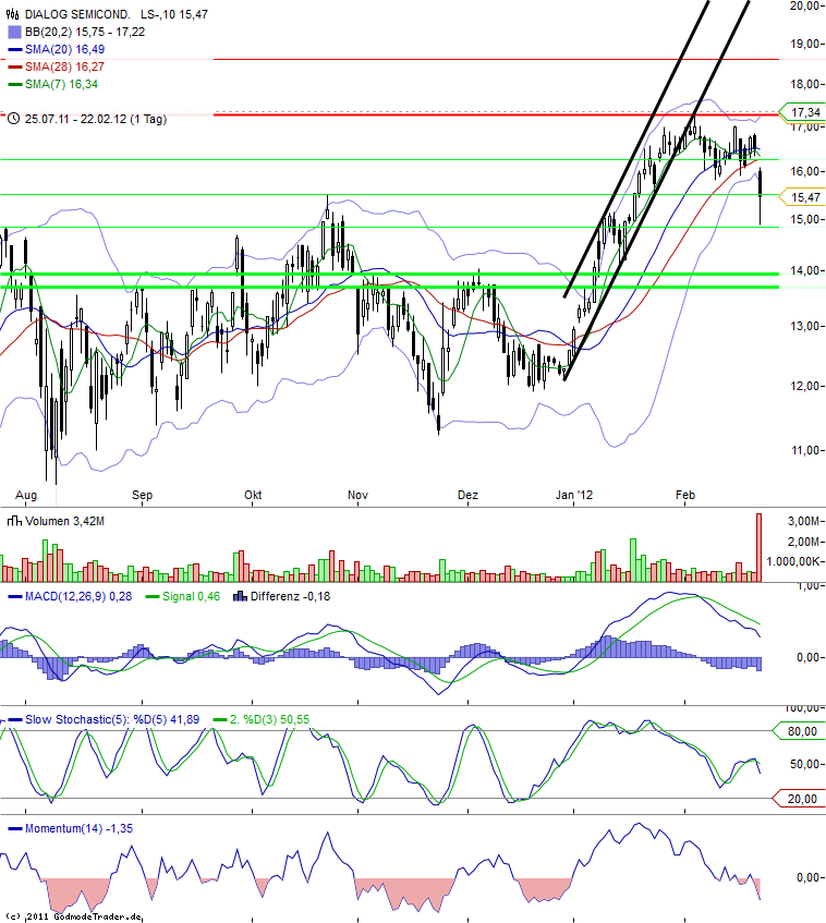 Wie gewohnt, um nicht zu sagen, every Quarter the same Procedure,..hat Dialog heute unter sehr hohem Volumen unter Gewinnmitnahmen ´Sell on good news´ gelitten (bis auf die Bruttomarge waren die Zahlen o.k) Dabei wurde die 38 Tageslinie unterschritten. Ebenfalls trat der Kurs aus dem Bollinger Band aus und hat auch ausserhalb geschlossen, positiv, nicht auf Tagestief, negativ mit einem down Gap (meist bearisch zu werten). I.d.R. kehrt der Kurs meist wieder ins Bollinger Band zurück, ebenso das gerissene Gap könnte vielleicht schon morgen geschlossen werden, muss nicht, kann aber so sein. 3 Punkte könnten also morgen für steigende Kurse bei Dialog sprechen: