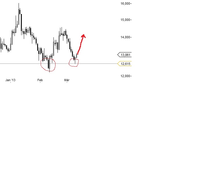 Denkbar wäre auch, dass der Kurs nochmal auf die 12,6 (ca.) zurückkehrt und sich ein Triple-Buttom bildet, der ebenfalls eine Umkehrformation ist.