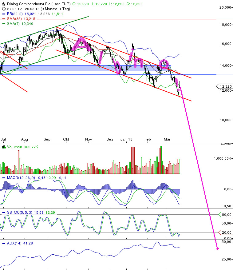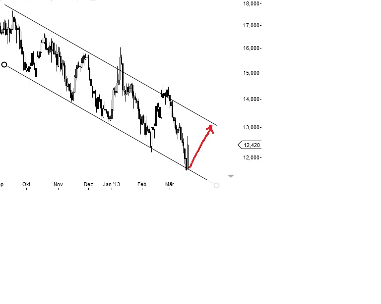 Die Frage ist, ob es ein Strohfeuer bis ca. 13,5 gibt oder ob der Abwärtstrendkanal dann endlich nach oben durchbrochen wird. Ich hoffe, dass den Baisse-Spekulanten irgendwann die Puste ausgeht.