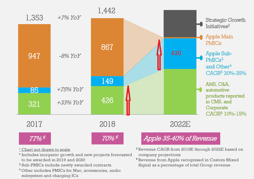 Sie haben zwar beim Balken 2022 keine Umsatzzahl genann, aber von der größe her müsste er bei 1,6 Mrd liegen, und der Anteil aus sub PMICs von Apple soll 2022 noch bei 30-35% liegen. Wenn ich die Größenverhältnisse übertrage entspricht der Apple Balkenteil mit den 430 Mio die mit ASM, C6A,... in 2018 gemacht wurden überein. Das passt dann auch exakt zur Balkengröße 1600 und 35 % PMIC Umsatzanteil von Apple.