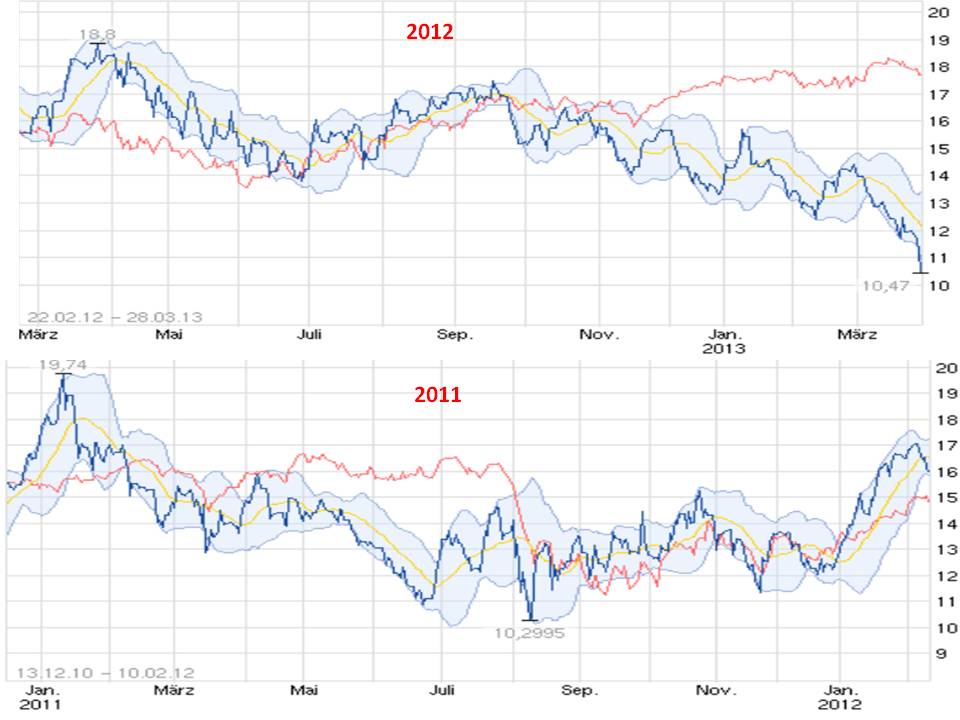 Es ist auch gut so, dass ein größerer Teil zu etwas mehr Ruhe aufruft, obwohl der starke Abgang in der letzten Woche einige sehr getroffen hat. So einen Niedergang hatte ich vor einigen Jahren bei einemAbsacken in Richtung ca. 9,- Euro mitgemacht. Danach kam der erst allmähliche und dann schubweise Anstieg in Richtung 20,- Euro.