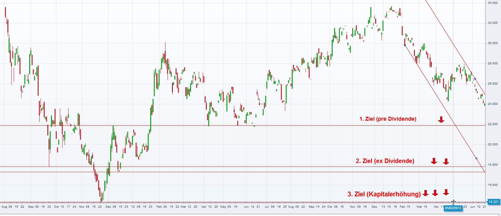 der seit dem Tief am 23.11.2011 (14,20 EURO) bestehende aufwärtstrend kanal wurde bei 29,80 euro nach unten durchbrochen.