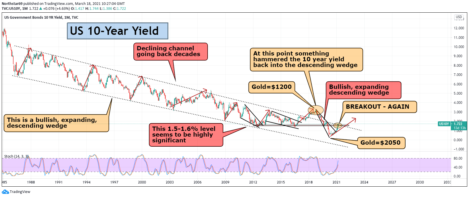 Na ja, kommt drauf an, wie weit man die Kausalkette durchgeht. " Annahme". Sollte die Inflation weiter steigen, müssten die T-Bills auch weiter steigen ( die waren auch schon weit über 10%, ich glaube in den 70gern). Für eine Entschuldung wäre eine Inflation gut, aber wenn die Renditen der Bonds nicht mitsteigen, kauft den Schrott niemand mehr. Dann muss die Fed kaufen, was die Schulden erhöht. Bei 5% Schuldendienst ist jetzt schon die Hälfte des Haushaltsbudgets verbraucht. Man kann auch ohne Kaffeesatz orakeln, dass die Schuldenmacherei noch weitergehen wird, für Infrastruktur Energiewende usw.