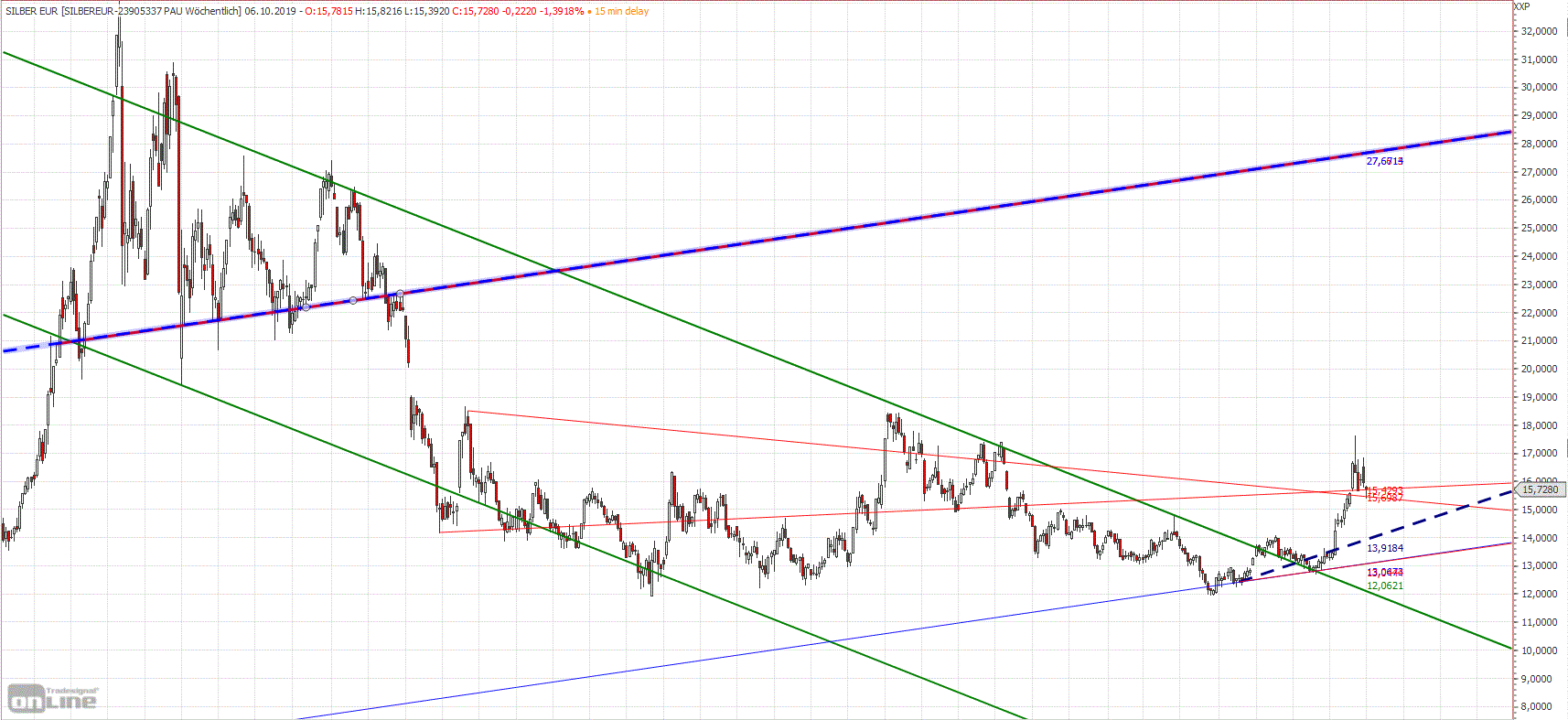 In diesem Zusammenhang spielt die untere Trendkanallinie eine tragende Rolle. Abgesehen von einem möglichen Fehlausbruch, der an dieser Stelle zwingend einkalkuliert werden muss, sollte diese wichtige Linie möglichst halten. Bei einem positiven Pullback in diesem Bereich stehen die Chancen für eine knackige Jahresendrally bei Silber auf 20 bis 21 USD ganz gut.
