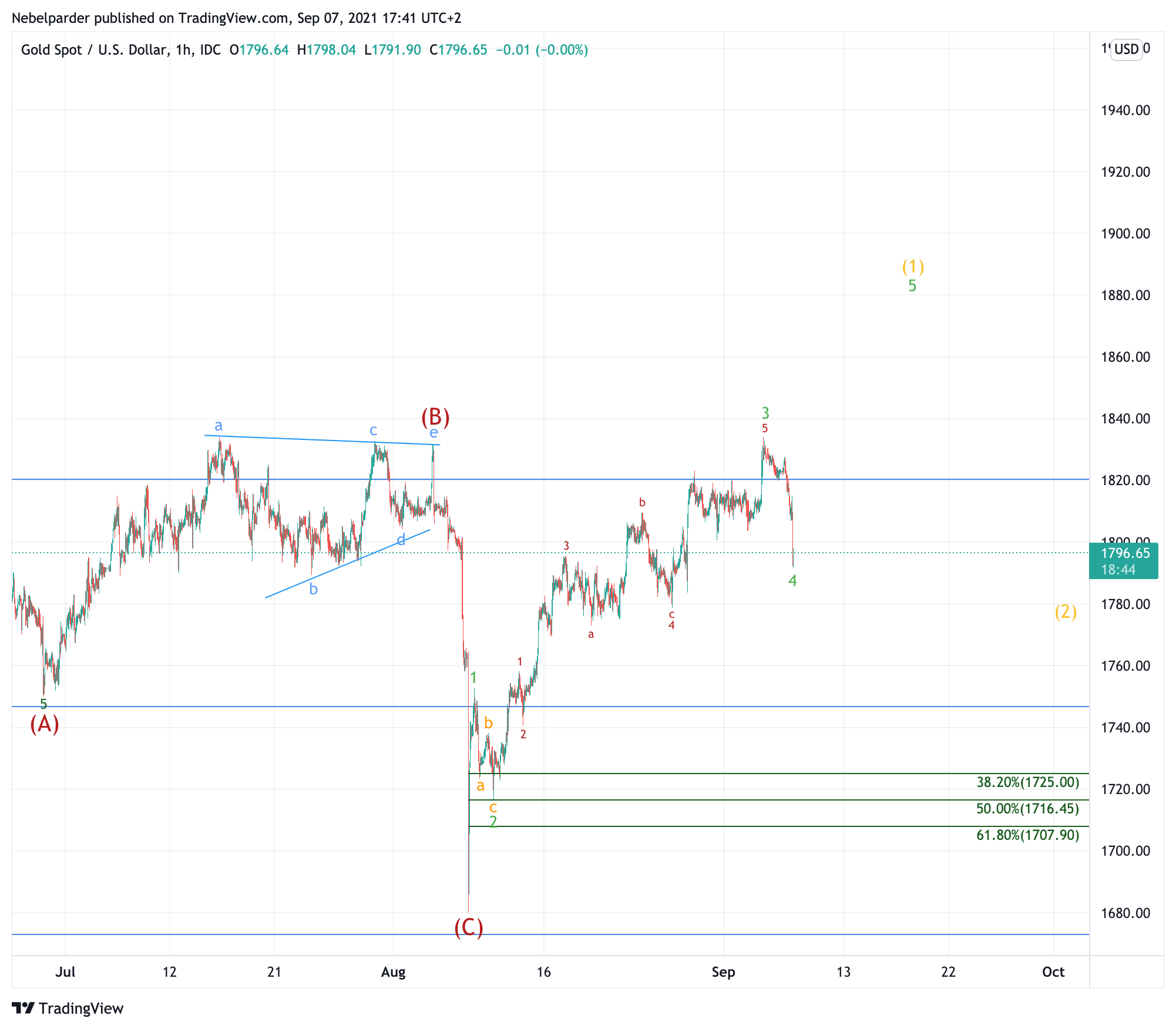 Es könnte z.B. sein, dass eine Welle 3 bei 1.834 $ abgeschlossen wurde und nun eine Korrektur bis ca. 1.790 $ erfolgen könnte. (primär erwartetes Szenario, da 1.773 $ nicht unterschritten wurden)