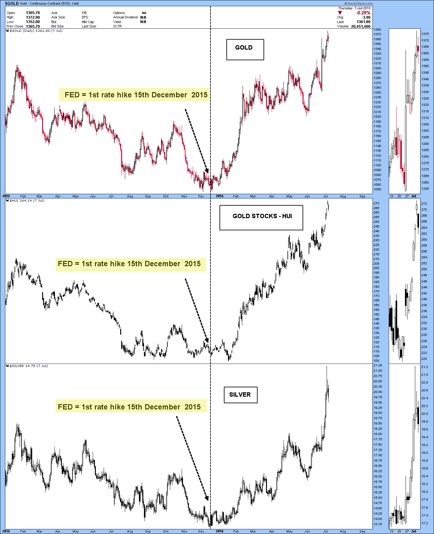 der Deutsch, Benjamin. Vor drei Wochen verkündet er noch den finalen Ausbruch und jetzt (kurz vor der heutigen FED-Sitzung) ist er kurzfristig (natürlich) doch eher wieder pessimistisch und "sieht" bei Fallen der Marke von 1756 (wieder mal ne neue Marke) Gold bei 1600. Dann interpretiert er ständig Grafiken, die er anscheinend selber nicht versteht und zieht sich das daraus, was seine konfusen Gedanken stützt; z.B., dass Zinserhöhungen mit rückläufigen Aktienmärkten verbunden sind - in der gleichen Grafik sieht man aber auch, dass das ein paar Jahre später nicht der Fall war.