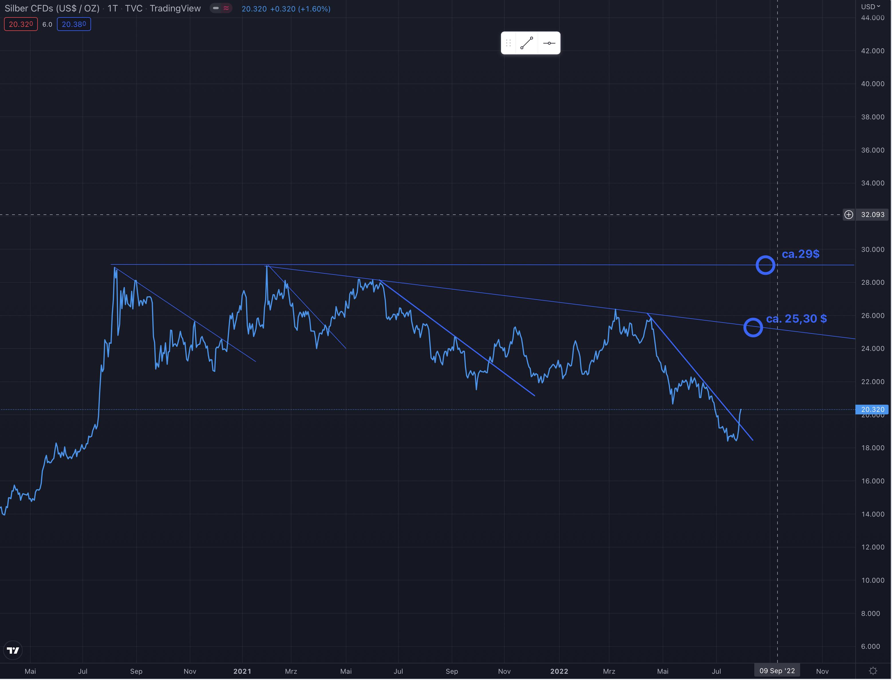 Zusätzlich kommt jetzt noch folgender Punkt hinzu: Mit dem jüngsten Sommertief hat Gold "zufällig" ziemlich genau das Tief der Welle A aus dem März 2021 (1.677 USD) getestet. Die Abweichung beträgt hier kaum 5 USD. Auch das Zwischentief aus dem August 2021 (1.678 USD) spielt in diesem Zusammenhang eine tragende und stützende Rolle.
