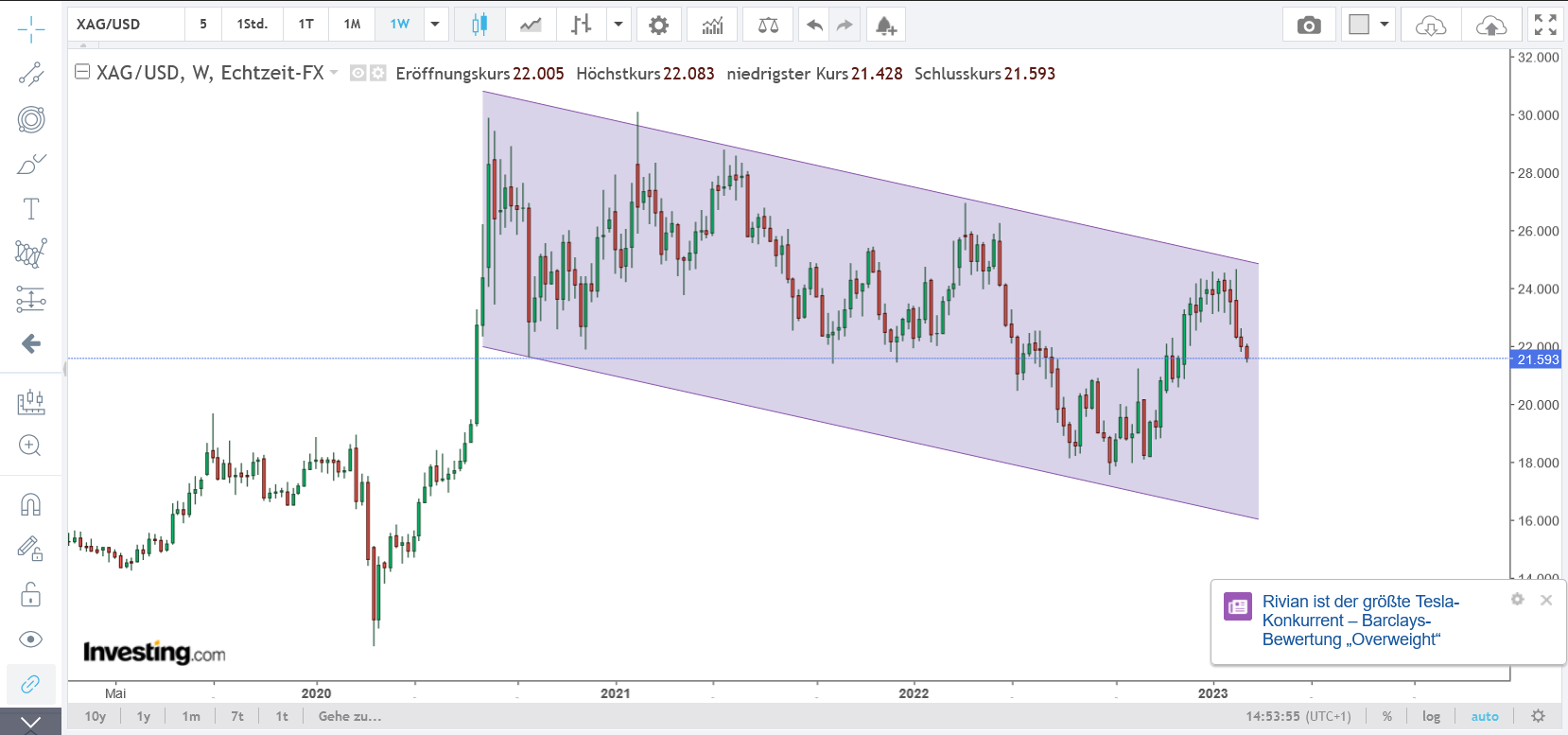 Silber handelte über fünf Jahre hinweg in einer Handelsspanne zwischen 14$ auf der Unterseite und 19$ auf der Oberseite. Seit dem bullischen Ausbruch Mitte 2020 ist das langfristige Chartbild grundsätzlich sehr bullisch.
