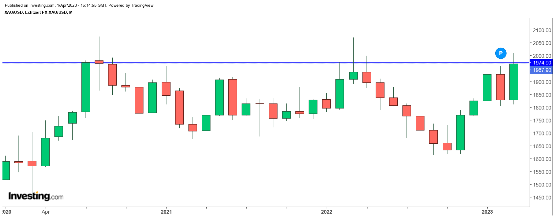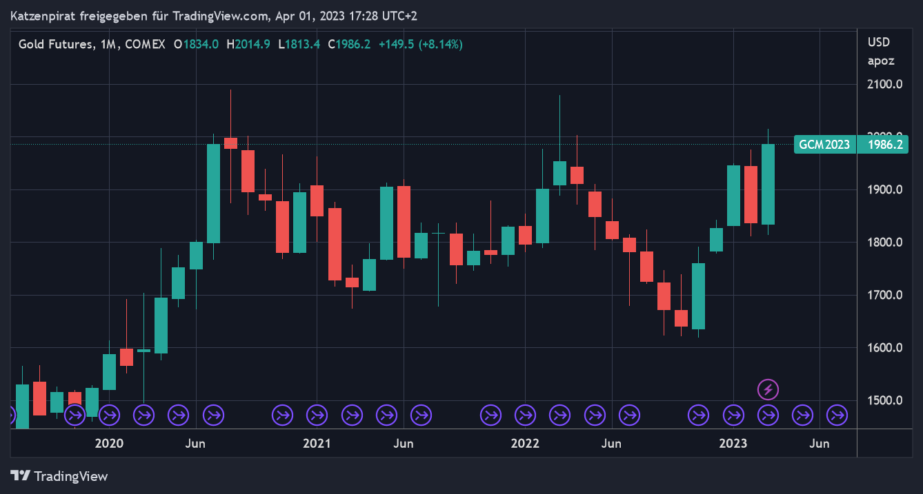 Nehm ich mal den positiven Blick laut Bussler haben wir dem höchsten Monatschluss ever und gleichzeitig Quartalsschluss in grünen Altpapier gewertet. Das die Drecksratten die Woche alles gegeben haben um das zu verhindern dürfte klar sein. Blöd so einem Schlusskurs kann man nachträglich nicht mehr korrigieren. Monatschart oder Quartalchart in Schrottwährung wird für 3/2023 immer ein Hochpunkt bleiben. Das einzige was jetzt geht es als Doppeltop hinzubiegen.