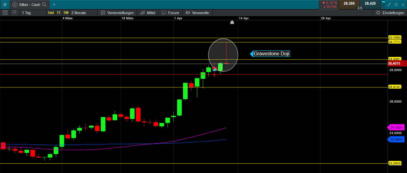 Für Silber wäre ideal, wenn Gold ein paar Tage seitwärts konsolidierte. Dann sollte ein Ausbruch auf 32 $ möglich werden. Das entspräche dann bei einem Goldpreis von 2'400 $ einem Ratio von 1:75.