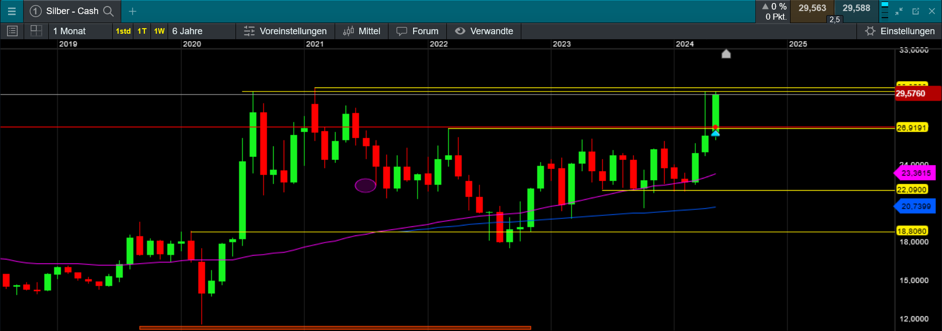 Spotsilber wurde am Freitag über 29 Dollar pro Unze gehandelt, auf dem Weg zu einem wöchentlichen Gewinn von fast 5%. Der nächste bedeutende Test wäre eine Herausforderung von 30 Dollar, ein Niveau, das es 2021 kurz übertroffen hat. Sollte das Metall 30.1003 Dollar pro Unze übersteigen, würde das die Preise auf den höchsten Stand seit mehr als einem Jahrzehnt anheben.