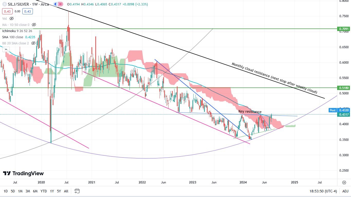 wir werden nach dem FOMC Meeting nächste Woche wieder steigen.Silber ist z.Z. stark volatil und lässt nach den Charts einige Möglichkeiten zu um für fallende bzw. steigende Kurse zu tendieren.Was wir aber gerade sehen ist eine relative Stärke der Minen gegenüber dem Metall, sodass ich denke das diese wirklich schnelle Abverkaufsphase bei Silber ihr ende gefunden hat.Der Silj/Silber ratio ist ausgebrochen.