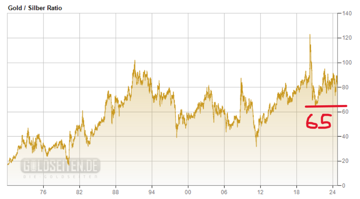 Ganz einfach zu rechnen: Sein Inflation Factor sieht Silber auf 150$ jeder kann selbst multiplizieren, welche Ratio sich ergibt, wenn die bei 60/50 oder 40 wäre. ( bei einer ratio von 50 ergibt sich ein Goldpreis von 7500$ )