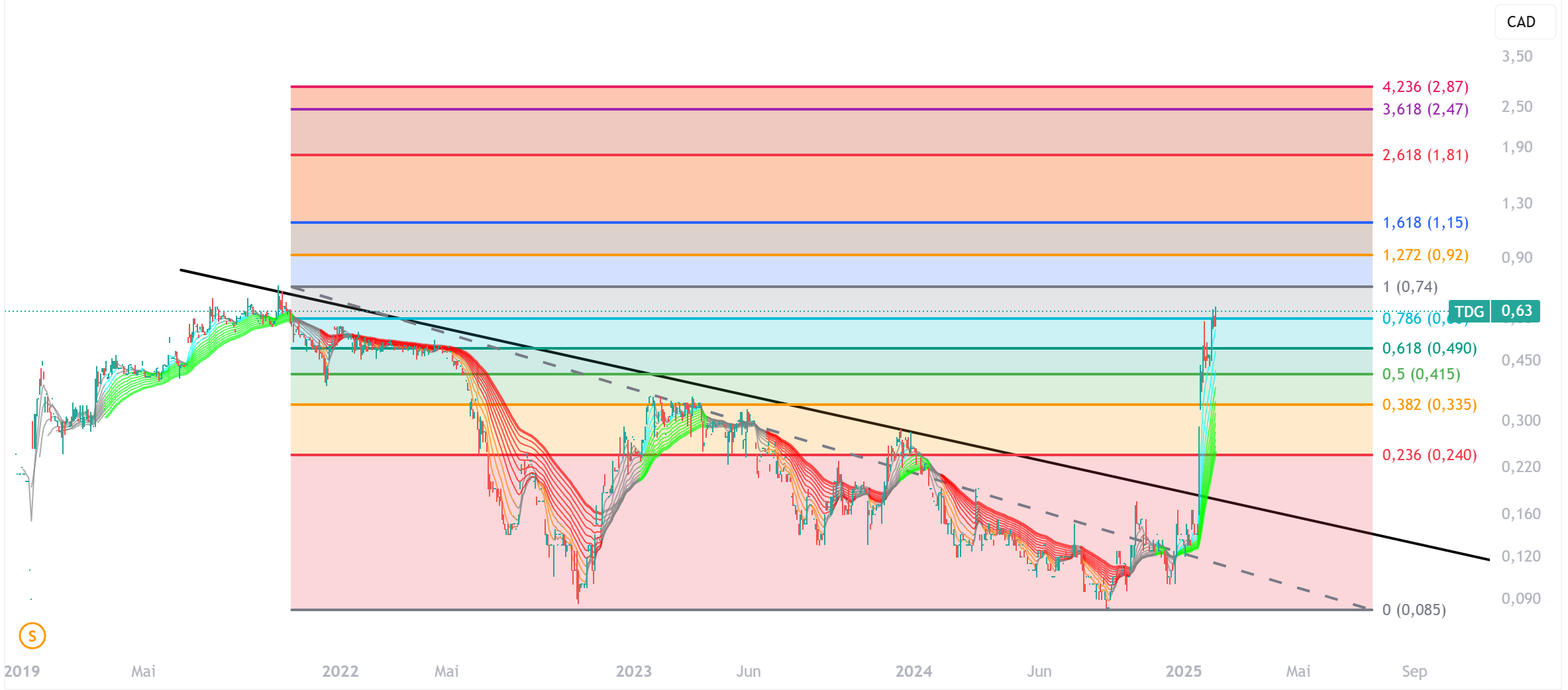 Ein bestätigter Ausbruch auf wöchentlicher Schlussbasis würde zunächst eine offene Kurslücke ab Juni 2022 bei ~704 anvisieren, gefolgt von einer weiteren offenen Kurslücke ab Mai 2022 bei ~770. Es genügt zu sagen, dass eine kleine Prise Gier, die in die stark angeschlagenen kanadischen Junior-Rohstoffaktien gepumpt wird, innerhalb weniger Monate einen Zugewinn von ~20 % im TSX-V generieren könnte.