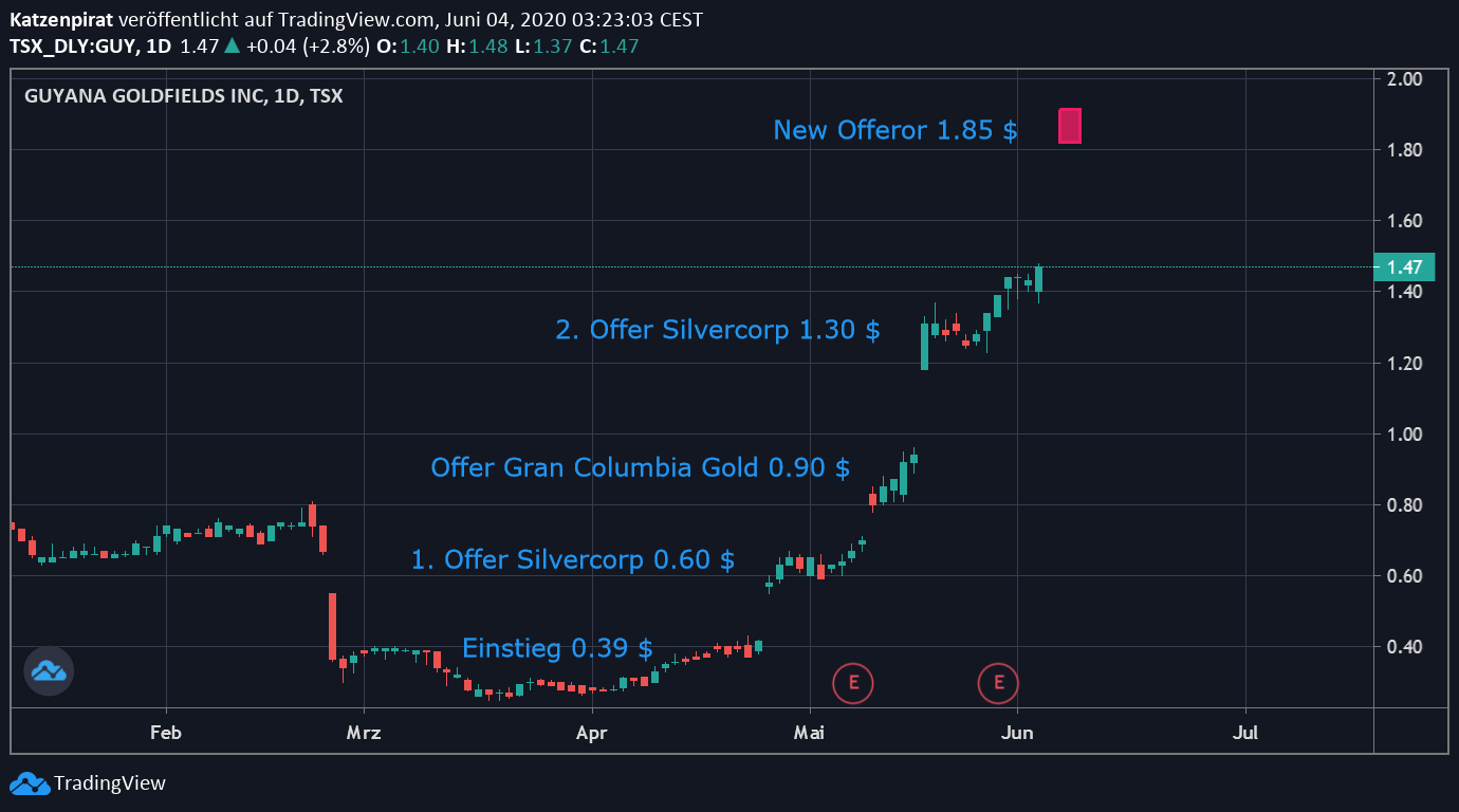 Ein neuer Player tritt auf den Markt und bietet 1.85 $. (Immer noch günstig, wenn sie die Mine wieder in Schwung bringen). Für mich wird das wohl der Trade des Jahres. Ich hatte beim Einstieg den richtigen Riecher und lag richtig diese Hand zu Ende zu spielen. (Etwas Eigenlob muss hier sein.)