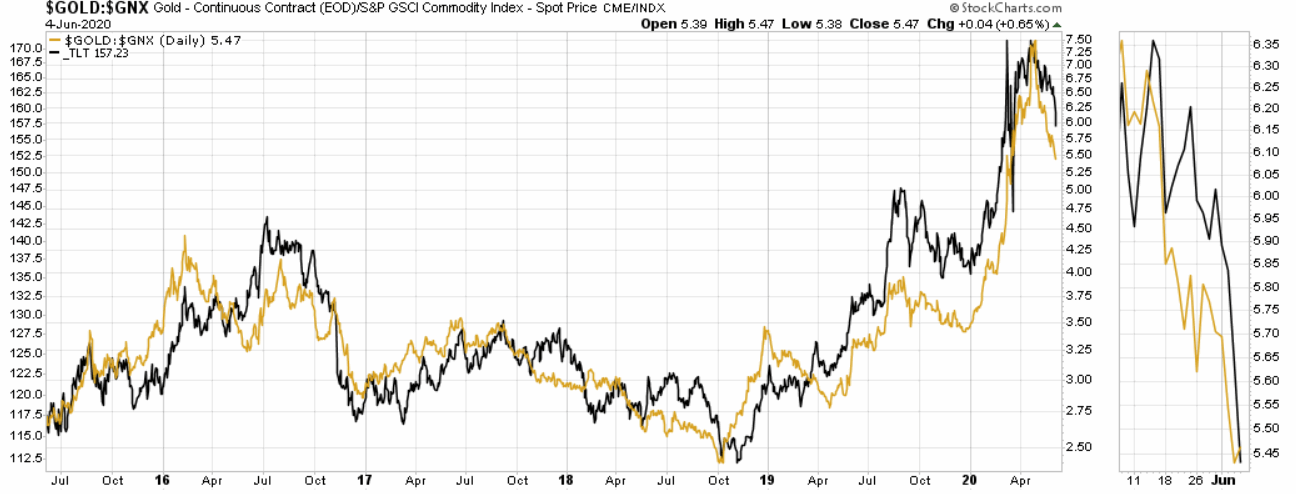 Weihnachten 2018 hatte die US Fed die komplette Wende in der Geldpolitik eingeleitet -- von Reduktion auf Lockerung. Läuft Gold besser als GNX (oder Copper) so ist Unsicherheit in der Wirtschaft zu erkennen. Läuft jedoch GNX relativ besser als Gold (Anfang 2016 bis zur Fed Wende), so steigt die Inflationserwartung an.