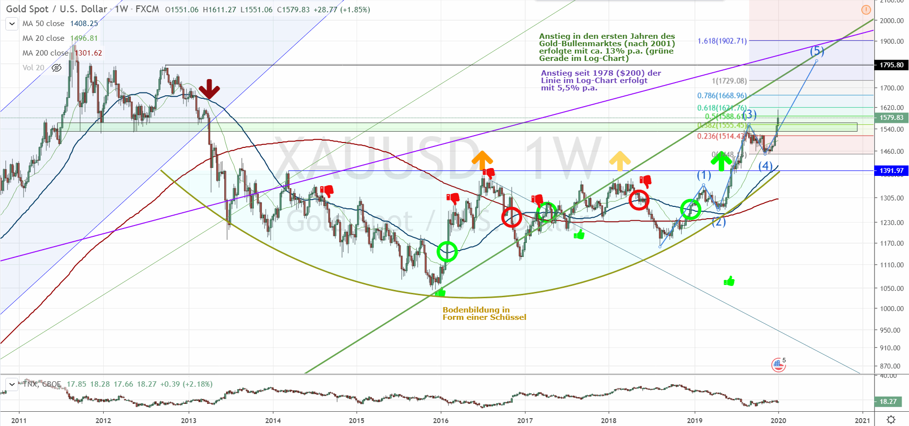 Kann Gold also nachhaltig über diesen ganz wichtigen Widerstand ($1530 - $1560) laufen, so wäre dieser damalige Einbruch Geschichte und die massive Übertreibung von 2011 wäre großteils abgearbeitet.