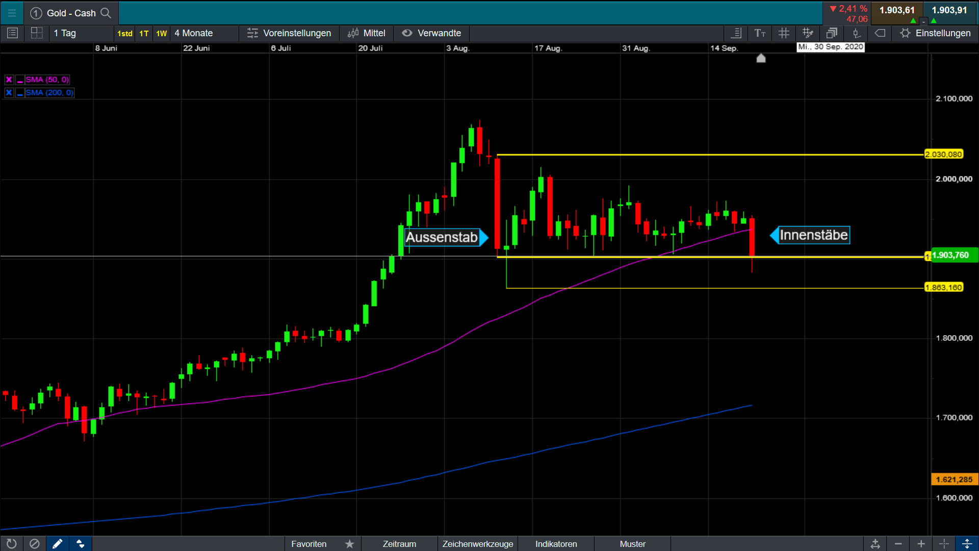 Wir haben zurzeit eine bilderbuchmässige Seitwärtskonsolidierung innerhalb des markanten Aussenstabs vom 11. August. Solange die nachfolgenden Innenstäbe auf Tagesschlusskurs innerhalb des Aussenstabes schliessen ist die Konsolidierung intakt. Wichtig ist, nicht unter 1'901 $ zu schliessen. Wir stehen heute auf Messersscheide und die Chance sind gross, dass wir in den nächsten Tagen nach unten durchgehen - aber, noch sind wir es nicht! Die nächste Unterstützung liegt bei 1'863 $, dem Verlaufstief vom 12. August. Wenn dieses nicht standhält, wirds düsterer, dann ist gut möglich, dass wir den MA 200 anlaufen bei ca. 1'750 $. Eine frühere Unterstützung gibt es nicht. Der langfristige Aufwärtstrend bliebe aber auch dann intakt.