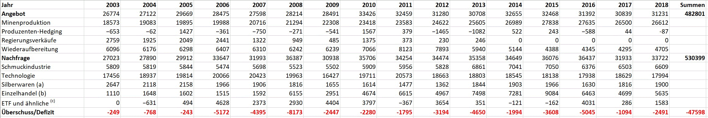auf Wikipedia bin ich auf eine Tabelle gestoßen die ich nicht ganz verstehe. In den letzten 16 Jahre ist das Defizit zwischen Förderung und Verbrauch auf über 47000 Tonnen angewachsen. Das sind immerhin eine 1,8fache Weltjahres Förderungsmenge. Wo kommt das fehlende Silber her? Es wird ja verbraucht, aber nicht gefördert. Auch sieht man an der Fördermengen, dass der Höhepunkt der Förderquoten überschritten oder zumindest erreicht ist. (Quelle Tabelle Wikipedia)