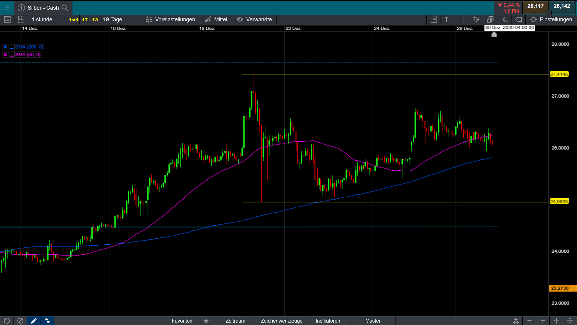 Nach oben müssen wir die 27.41 aus dem Markt nehmen, noch besser ca. die 27.70, dann ist die Chance gross, dass wir wieder 30 $ anlaufen. Insgesamt ist der Chart im mittleren Zeitfenster stabil und entspannt.
