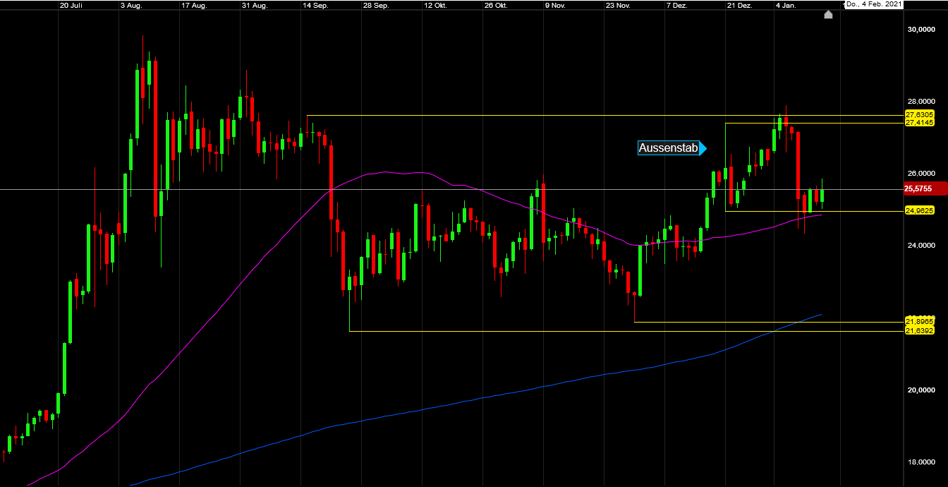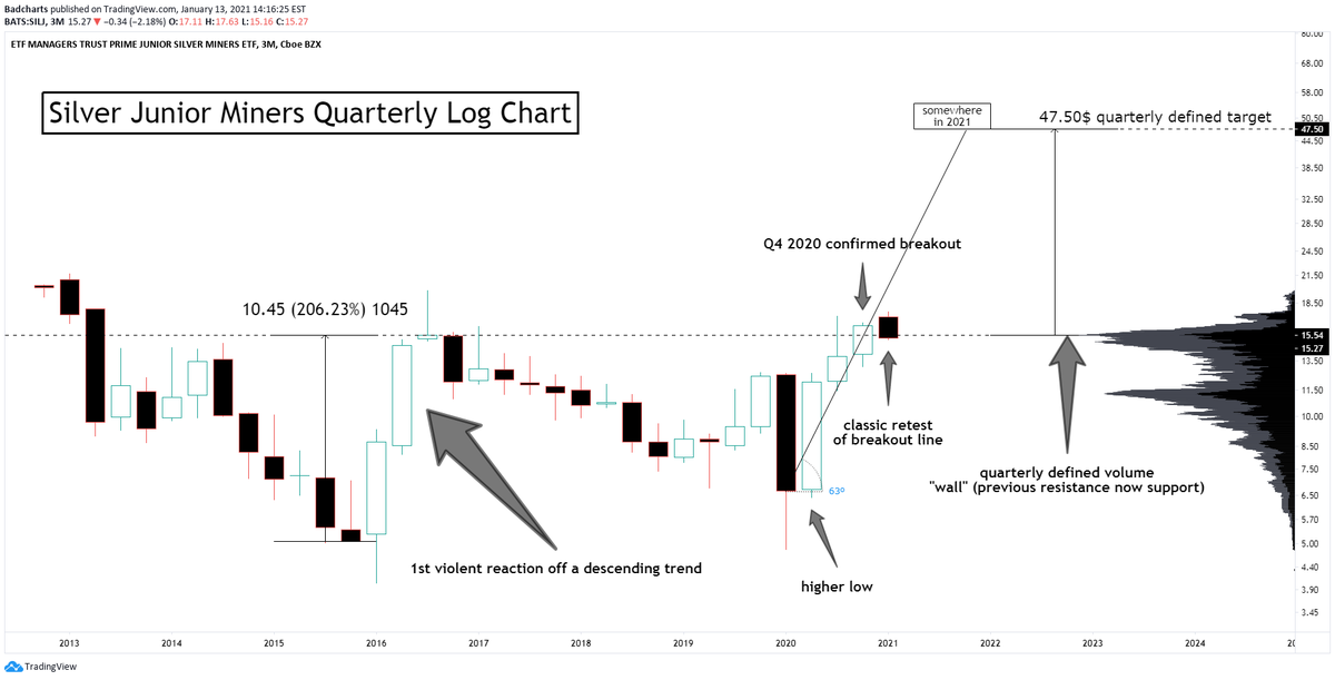 Silber sieht deutlich besser aus und hat seine Abwärtskonsolidierung schon verlassen , sieht man auch an dem Ausbruch vieler Silberminen über den Dezember. Silber hat nach dem mini crash nur einen Backtest des Ausbruchsniveaus vollzogen. Also deutlich besser als Gold, nur kann sich Silber bestimmt nicht einem erneuten Abtauchen von Gold entziehen. Wie gesagt bin auch gespannt und angespannt, aber ich denke sobald Biden an der Macht ist und seine 2 Billionen Dollar Tüte verkündet sollte es das gewesen sein.