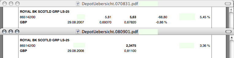 Hab mir gerade den Spaß gemacht, einen 12 Monate alten mit dem aktuellen Depot-Bestand zu vergleichen. Leider wird von meiner Bank nach Splits, Re-Investments und Ausübung der Bezugsrechte der aktuelle Einstandskurs nicht mehr angezeigt, aber es wird auch so deutlich.